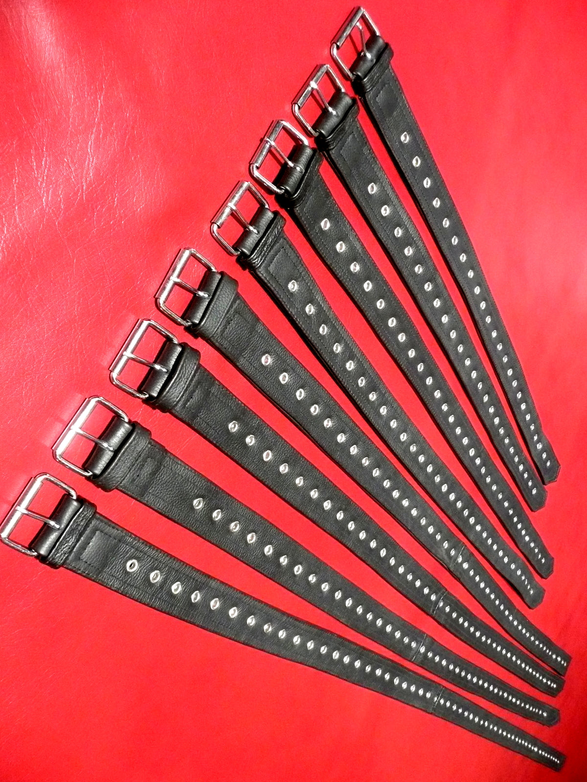 Remmene er syet af meget robust koskind, som normalt bruges til fremstilling af tunge motorcykeldragter, og hullerne er placeret i hele remmens længde, så der altid er ét, der passer i situationen.
