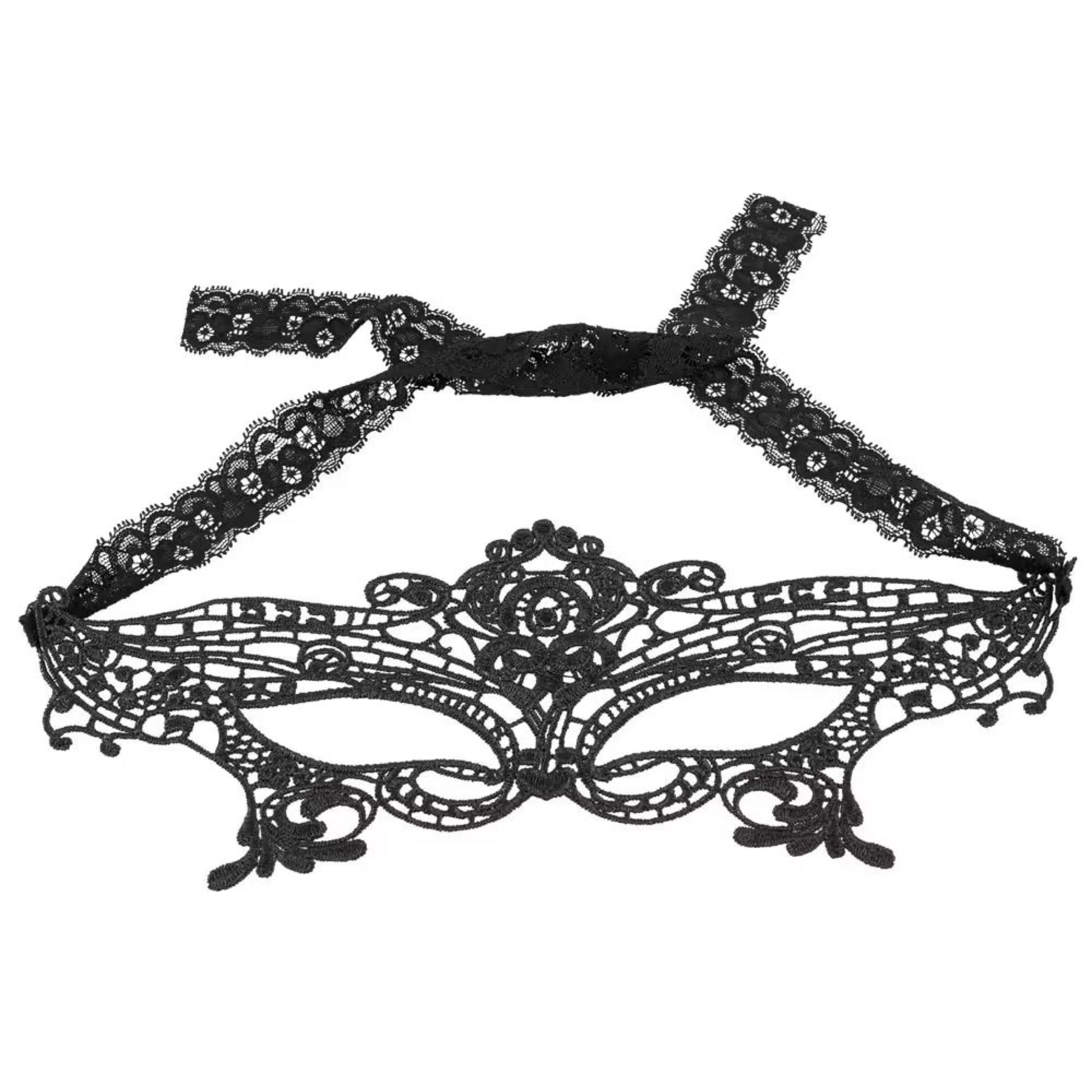 Fang alles opmærksomhed med denne sorte, broderede maske. Maskens åbninger fremhæver dine øjne på den smukkeste – og mest dragende – måde. Det tynde blondebånd bindes i nakken og sikrer en perfekt, tætsiddende pasform.