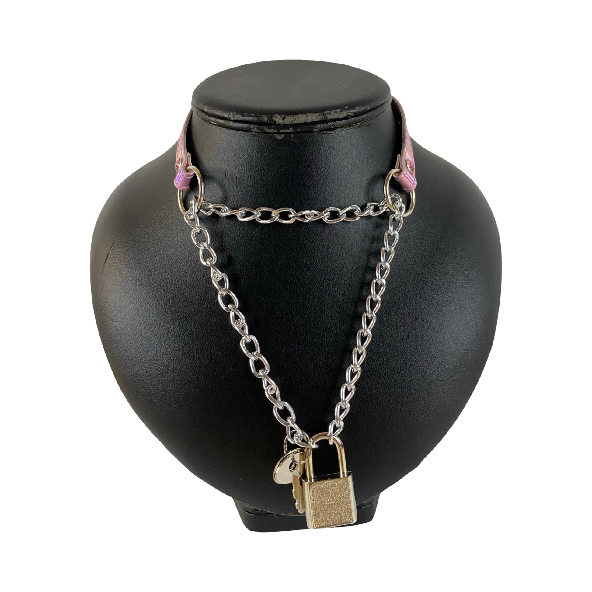 Håndlavet og unik choker med hængelås og kvæle-funktion. For ultimatil cute BDSM vibe. Halsbåndet er fremstillet med lyserød skind for og er således ikke vegansk. Overfladen er shiny lyserød med regnbue nuancer og nitterne har lyserøde gems.