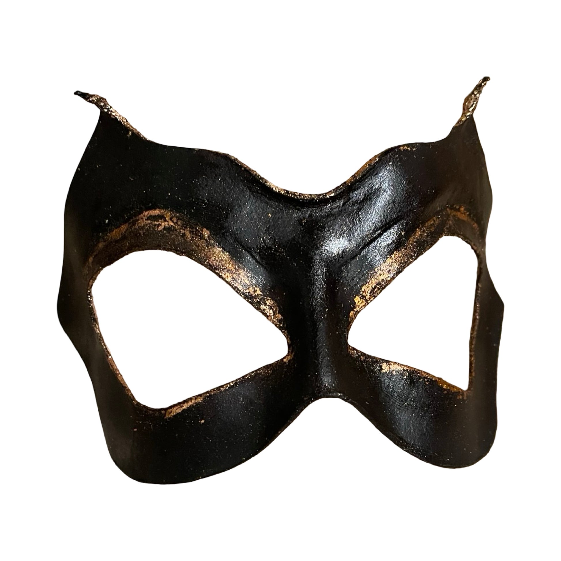Masken er indfarvet i hånden og efterbehandlet med læderfedt. Med detaljer af metallisk folie.