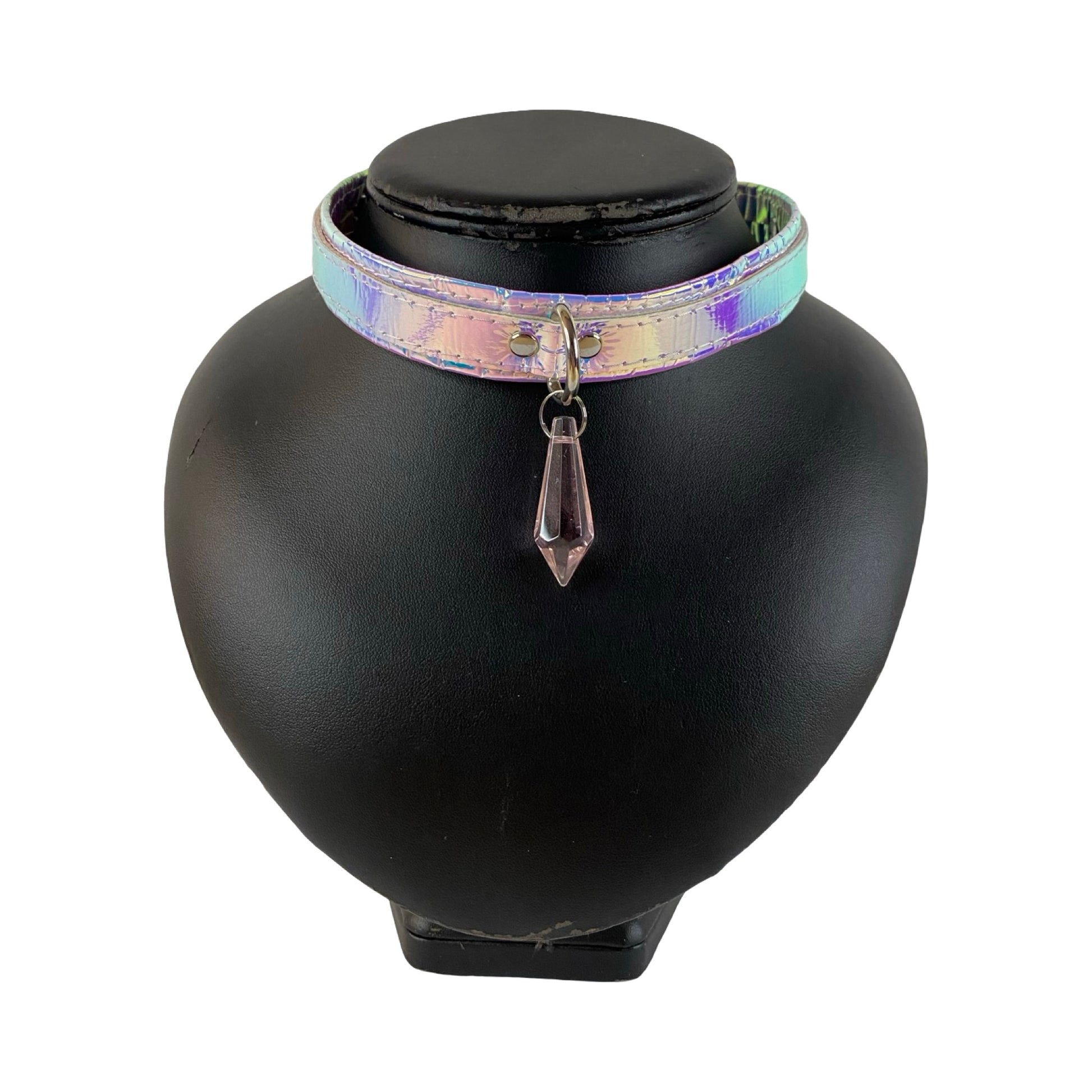 Håndlavet og unik BDSM collar med rem-detalje og hængende lyserød gem. Overfladen er shiny rainbow og halsbåndet er forsynet med en d-ring i midten der både sender BDSM vibes, men som også kan anvendes til at sætte en snot i.