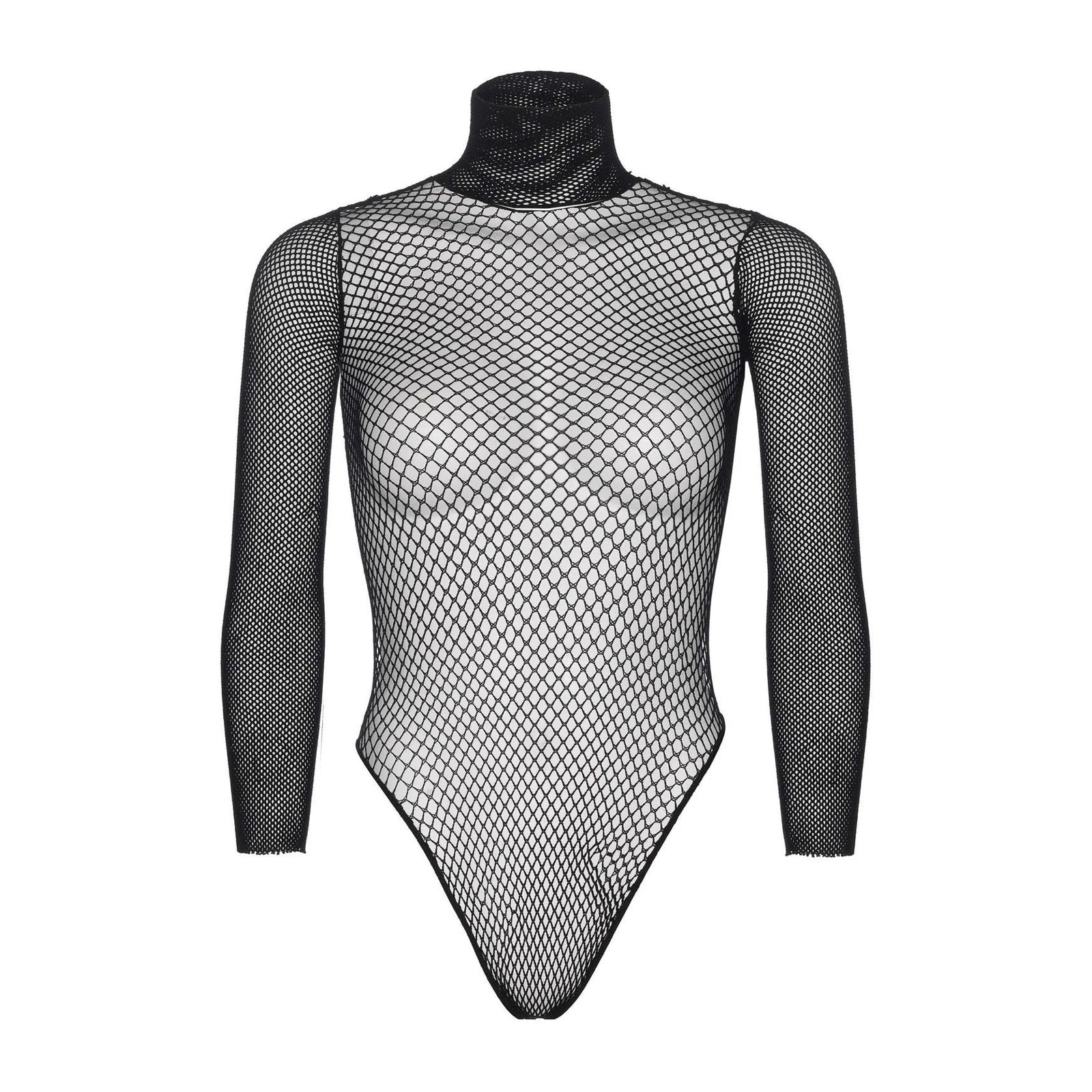Smuk net body med lange ærmer, høj hals og høje benudskæringer. Cuttet giver en smuk lang silhouette med lange ben. Dragten kan åbnes for neden så det er let at komme på toilet eller komme til at lege!