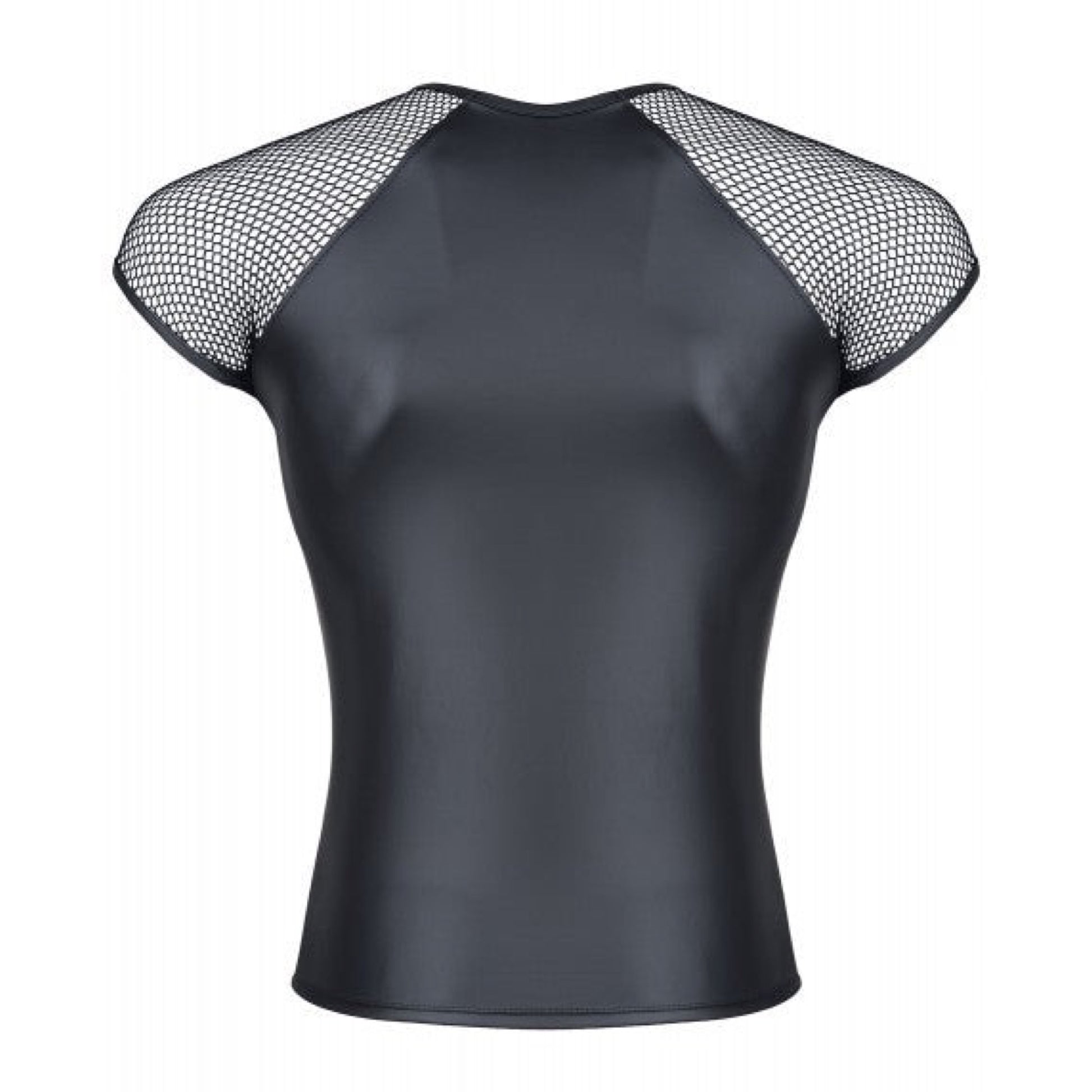 Wetlook t-shirt med ærmer i transparent net. Snittet fremhæver skuldrene og giver et maskulint udtryk. T-shirten er lidt kort i fittet så den passer godt til sexfester, en tur i klubben og legeaftaler.
