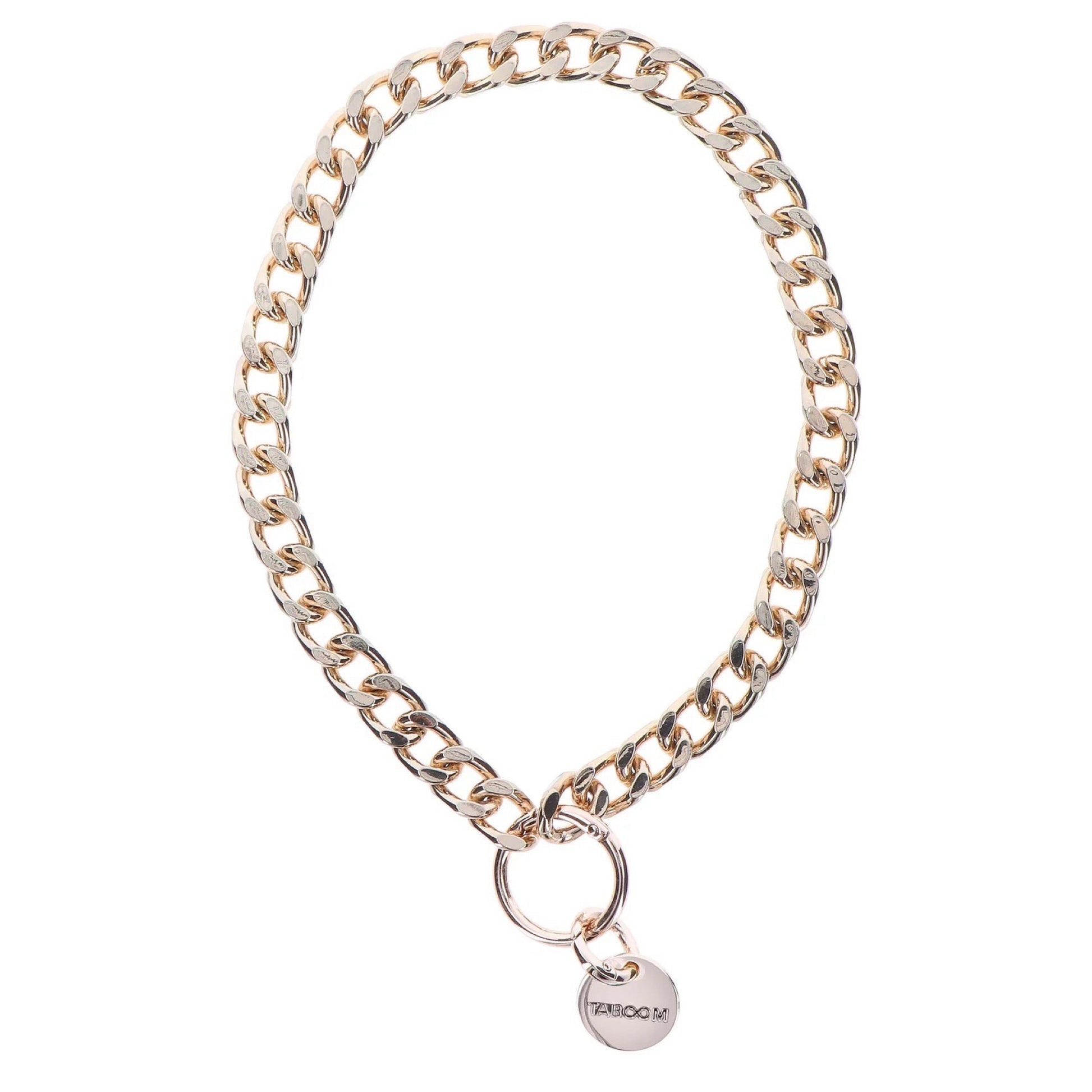 Dette statement halsbånd med snor er det perfekte sæt til dig, der vil gøre et uforglemmeligt indtryk. Både halsbånd og leash er stærke og fremstillet af skinnende guld-metal og vegansk læder.